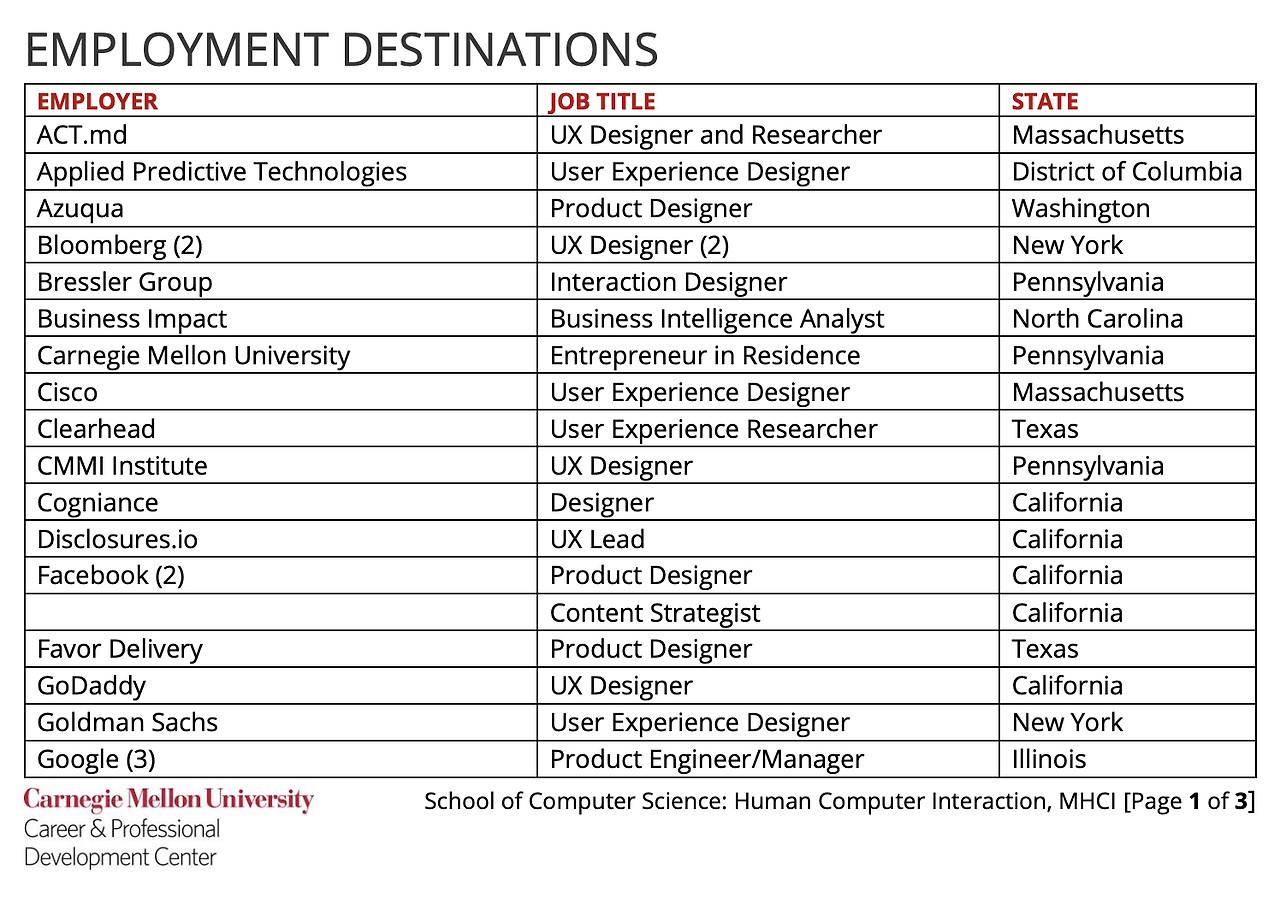 현재 미국 UX 디자인 업계의 수준이 많이 상향 조정되어있고, 취업시장도 포화상태에 다다랐습니다. 몇 년 전에는 카네기멜론대학의 MHCI를 나와도 충분히 좋은 대기업에 취업이 가능했지만, 이제는 절대 고작 1년제 프로그램으로는 상위권 대기업 (구글, 애플, 마이크로소프트, 페이스북 등)에 입사하기 어렵습니다. MHCI는 항상 취업률 100%, 평균 연봉 $96,800를 광고하는데요, 자세히 회사 명단을 살펴보시면 여러분들이 아는 실리콘밸리 대기업의 취업률은 낮습니다. 대부분 미국 지방 곳곳에 흩어져 스타트업이나 중소기업으로 취업합니다. 물론 유명 대기업 취업이 목표가 아니시면 문제가 아니지만, 페이스북, 구글, 애플 등등 대기업 취업의 꿈만 가지고 오시면 나중에 큰 낭패를 보실 수도 있습니다.