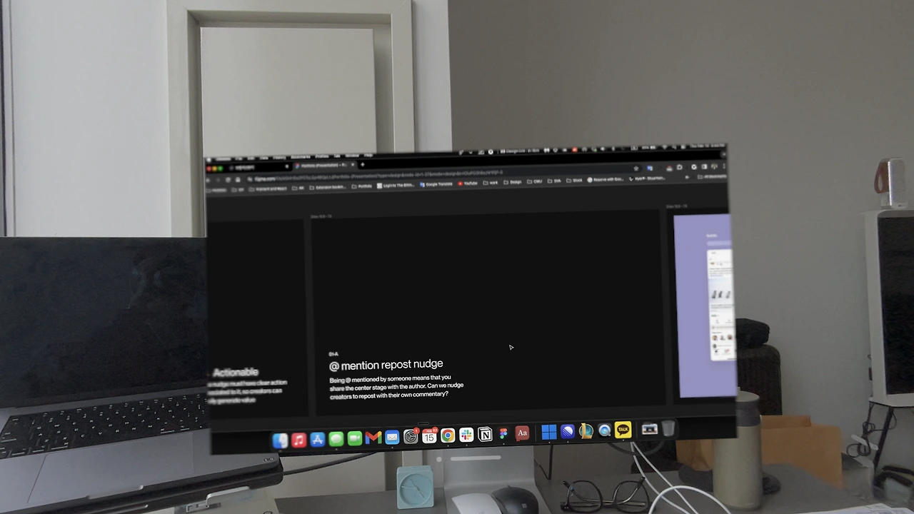 물론 맥 화면공유로 모든 작업이 가능은 하나, 구글밋같은 화상회의에 들어갈 땐 비전프로에서 야심 차게 선보인 페르소나로 미팅을 들어가는 것을 기대했으나, 그게 되지 않습니다. 따라서 사람들은 그냥 스키고글을 착용한 제 모습을 보게 되어 회사미팅에는 착용이 사실상 어려웠습니다.