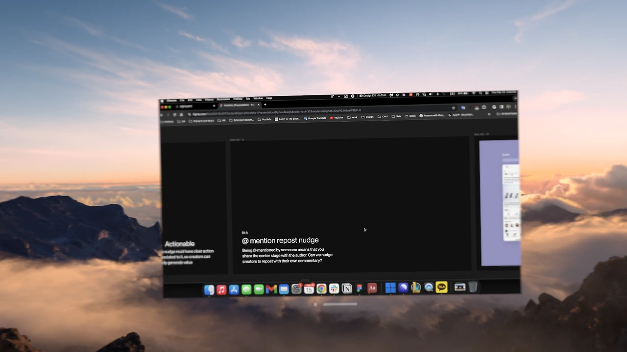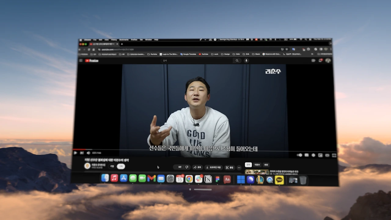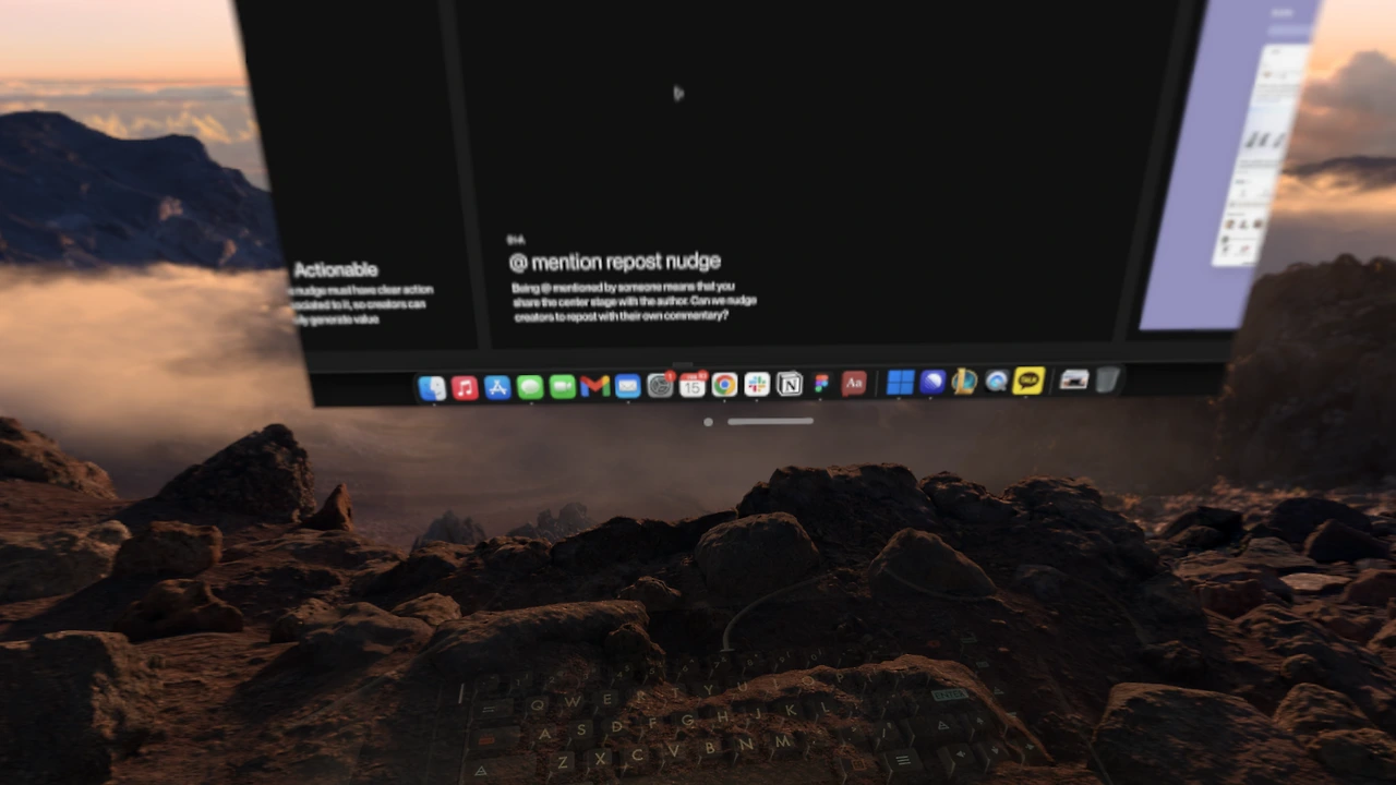 비전프로는 맥북의 화면을 공유해서 크게 MR환경에 띄울 수 있는데요, 전 이게 가장 좋은 기능인 것 같습니다. 특히 자유자재로 화면 사이즈를 키워서 큰 화면으로 작업할 수 있다는 점은 집중하기에도 너무 좋았고, 또한 VR 모드로 들어가서 산 꼭대기에서 작업하는 환경을 만드니 너무 집중이 잘 되었습니다. VR모드로 들어가면 키보드가 안 보이면 어쩌나 걱정하실 수도 있지만, 디지털 크라운을 돌려서 AR/VR의 비율을 미세하게 조절이 가능해서 키보드까지는 보이는 정도로만 VR을 켜시면 됩니다.