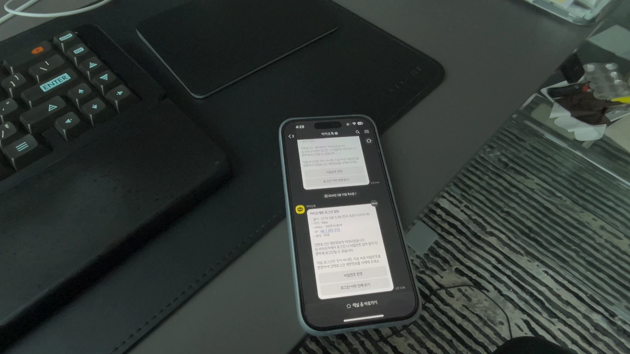 AR기기의 최대장점은 주변환경을 그대로 볼 수가 있다는 점인데요, 비전프로를 착용한 채 카카오톡을 사용하려고 아이폰을 들여다보면 화면이 너무 뿌옇게 나옵니다. 읽기가 조금은 어려울 수 있습니다. 아래 비전프로로 보는 시점을 스크린캡처 해보았습니다.