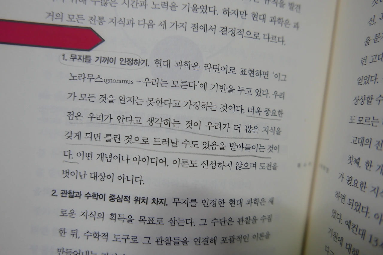 사람은 자신의 경험과 지식으로 인생을 살아가고 있습니다. 배움에 적정선이 있을까요? 이 정도만 알면 난 충분히 인생을 사는데 아무런 문제가 없어!라고 흡족할 수 있을까요? 저마다 살아가는 방식이 달라 만족할 수도 있겠지만 저는 꾸준히 경계하는 부분이에요. 혹시나 나의 오만으로 인하여 깨달음의 기회를 잃는 거 아닐까? 어릴 때는 모르는 것에 대해 굉장히 부끄럽고 창피해서 몰라도 아는 척을 하는 경우가 꽤나 있었던 거 같아요. 그러다 보니 모르고 넘어가게 되는 부분이 상당히 많더라고요. 이것이 굉장히 큰 문제라는 것을 알고 난 후부터는 모르는 것에 대한 인정이 빠른 편이 되었어요. 모르는 것에 대해 알고 싶은 욕구가 커지니 인생이 달라지더라고요. 내가 아무리 책을 많이 읽고 경험치가 쌓여도 이우주에 엉겹의 시간 동안에 일어났던 모든 일을 알 수는 없기에 모르는 일이 많은 것이 당연한 일일지도 몰라요. 우리 무지를 인정하고 "아는 것이 힘이다."라는 말처럼 더 많이 알아가도록 노력을 해봅시다.