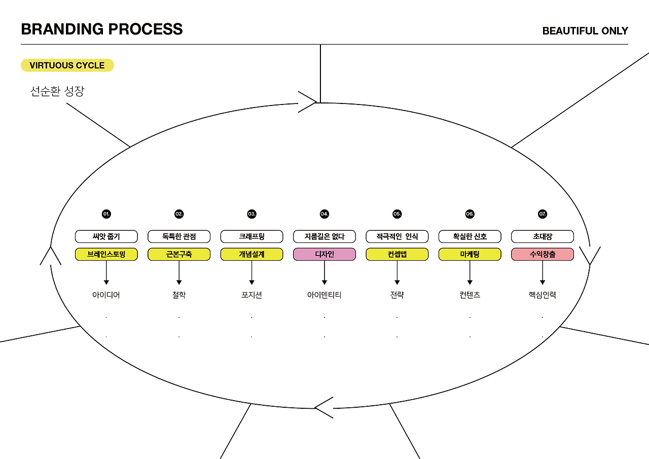 브랜딩과 마케팅 업무를 진행하다 보면 여기저기 들리는 잡음들 재정상태, 실무자들 간의 상호 소통 문제 등 다양한 문제로 길을 잃게 되는 경우가 발생되기 마련이에요. 그래서 무엇보다도 유연한 태도와 접근이 중요한 거 같아요. 닭이 먼저냐? 알이 먼저냐?인 거처럼 콘셉트 맵을 멋지게 구상했다 하더라도 막상 사회에서 부닥쳐 일하다 보면 수정해야 할 부분들은 반드시 생기거든요. 내 고집을 밀어붙이기 전에 내가 틀렸을 수도 있다는 생각으로 재점검의 시간을 가져도 충분한 거 같아요. 같은 일을 두 번 세 번 하기 싫다면 말이죠.