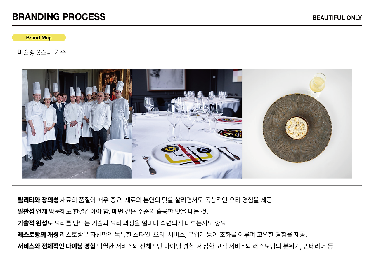 최종적으로 이상적인 고객 프로필을 완성하고 미래의 고객들이 어떤 서비스를 경험했으면 좋을지 고민하다가 그들이 익숙한 퍼스트 클래스, 5성급 호텔, 미슐랭 3스타 경험을 100% 만족시킬 순 없겠지만 매우 엄격한 기준을 거쳐 선정되는 미슐랭 3스타를 기준으로 삼고 싶었어요. 한 번의 미슐랭 3스타가 아닌 매년 그 명성을 이어간다면 탄탄한 실력뿐 아니라 모든 환경이 프로의식으로 똘똘 뭉쳐 최상의 서비스를 제공하고 최상의 만족감을 받을 수 있다고 생각했어요. 미래의 고객들이 그런 한 줄 평을 남겼으면 좋겠거든요. "모든 게 완벽했다!"