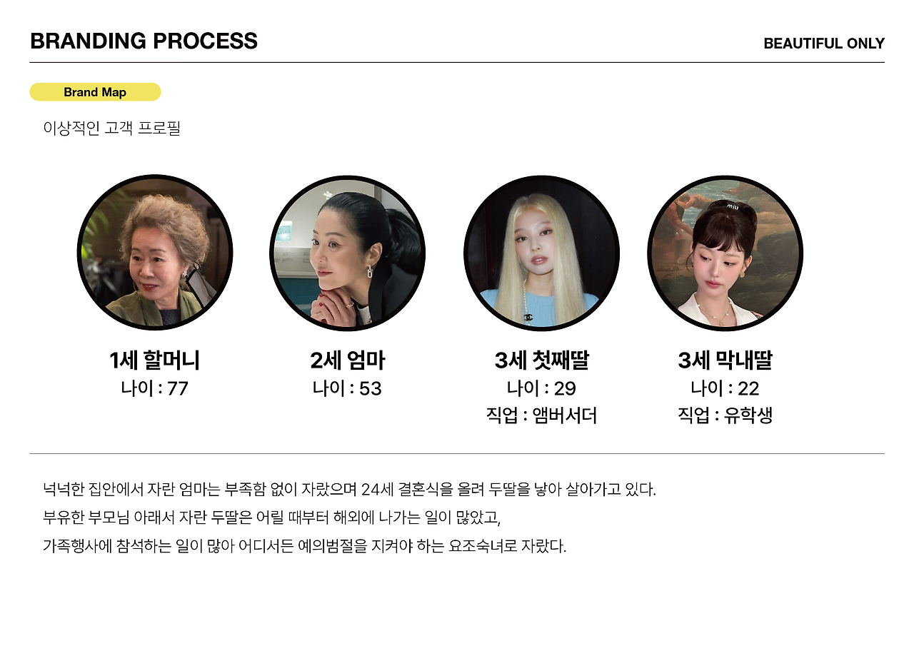 그래서 최종적으로 실무의 이해도를 위해 머릿속 가상인물을 셀럽 속에서 픽해봤어요. 재벌 1세를 담당하는 할머니는 제가 너무나도 좋아하는 밀라논나님과 윤여정 배우님 중에 고민했지만 윤여정 배우님의 단단함과 패션 센스가 이 시대 모두의 워너비라서 최종 픽했어요. 제가 마치 영화 캐스팅하는 것처럼 신나는 상상이거든요. 재벌 2세를 담당하는 엄마는 최화정님, 이영애님, 고현정님 중에 고민을 하다가 우아함 뒤에 털털함이 사랑스러워서 고현정님을 픽했어요. 그리고 재벌 3세는 샤넬 앰버서더인 제니와 미우미우 앰버서더인 장원형을 픽했습니다.