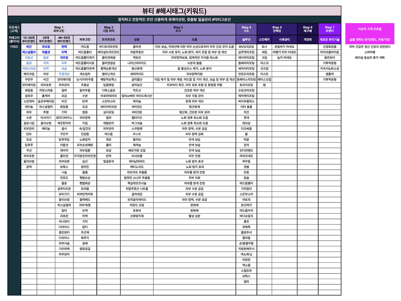 내가 알고 있는 모든 것을 비워내고, 새로운 모든 것을 편견 없이 받아들이겠다는 마음가짐으로 트렌드 조사를 시작합니다. 전문 업체에 요청해서 받을 수 있는 자료도 받고, 하나하나 발품을 팔아서 얻을 수 있는 것들도 가리지 않고 수집을 합니다. 씨앗을 줍는 과정과도 비슷하죠. 비슷한 작업을 기존에는 인스타그램을 통해서 했는데, 확실히 유튜브 시장이 열리고 유튜브에서 시장조사를 하게 되는 거 같아요. 한 분 한 분 만나서 인터뷰할 수 없으니 그들의 영상을 면밀히 나노 단위로 분석하면서 공부하는 방법밖에 없거든요. 그러면서 키워드 정리를 1차 했어요.