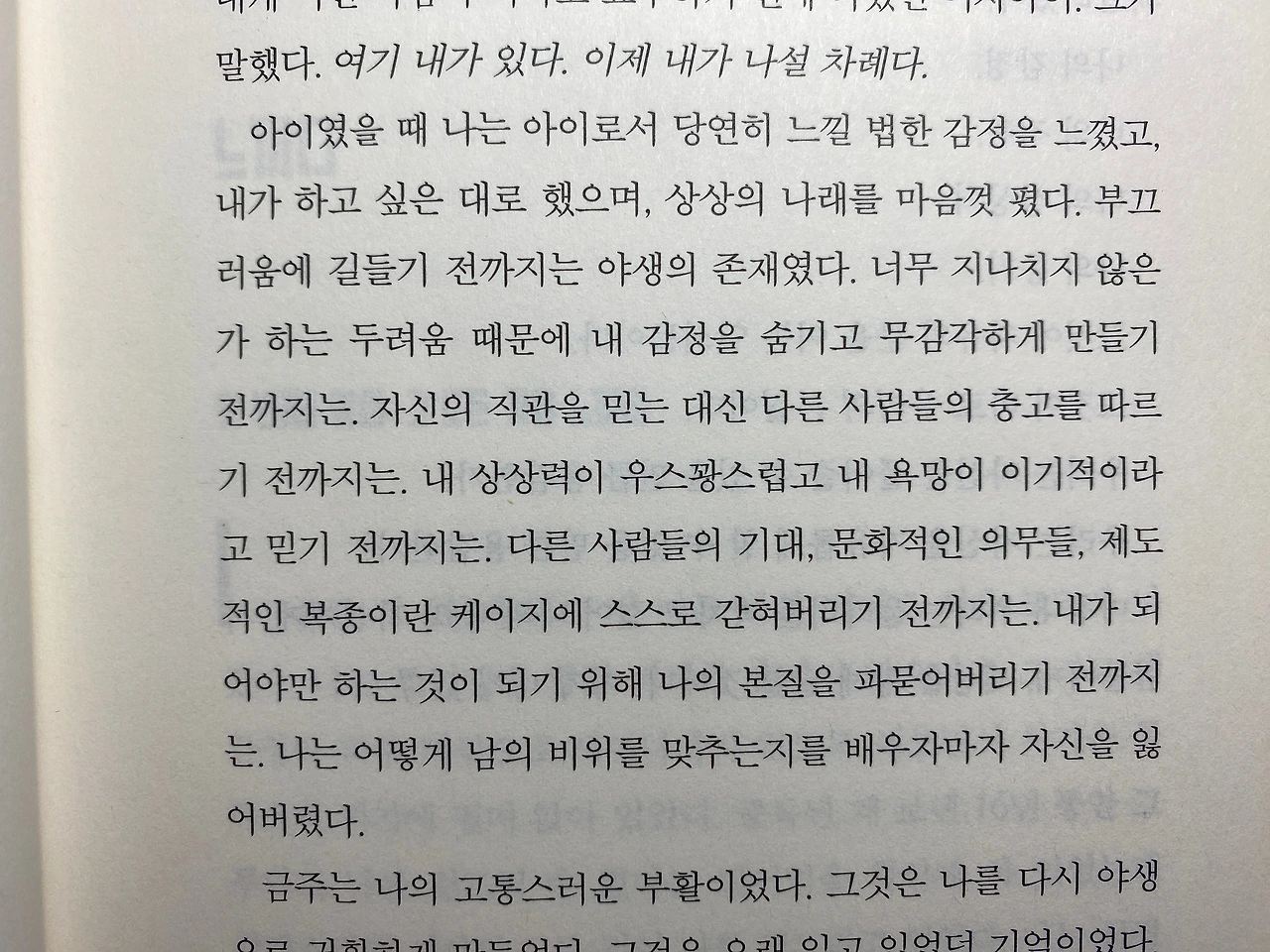 책 속에 "아이였을 때 나는 아이로서 당연히 느낄 법한 감정을 느꼈고 내가 하고 싶은 대로 했으며, 상상의 나래를 마음껏 폈다... 나는 어떻게 남의 비위를 맞추는지를 배우자마자 자신을 잃어버렸다.", "더 용감할수록 더 많은 행운을 얻게 되는 법이죠.", "다른 사람들이 자유롭게 내버려 두는 것이야말로 스스로 자유로워지는 것이다." 이 3 문장이 와닿았습니다.