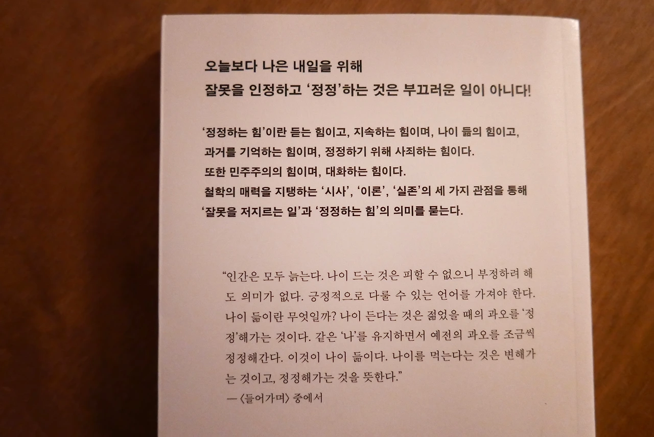 40대가 된 지금, 이 문장은 더욱 깊게 와닿았다. 20대와 30대에 내가 옳다고 믿었던 가치관이 이젠 어딘가 낡고 어색하게 느껴지는 순간들이 있다. 그 시기엔 그 나름의 이유로 선택했고 집중했지만, 시간이 지나며 생각도 행동도 수정이 필요함을 절실히 느낀다. 예전의 나를 부정하는 것이 아니라, ‘정정’해가며 다시 살아간다고 생각하니, 조금은 더 멋진 어른이 되어가고 있는 것 같았다.