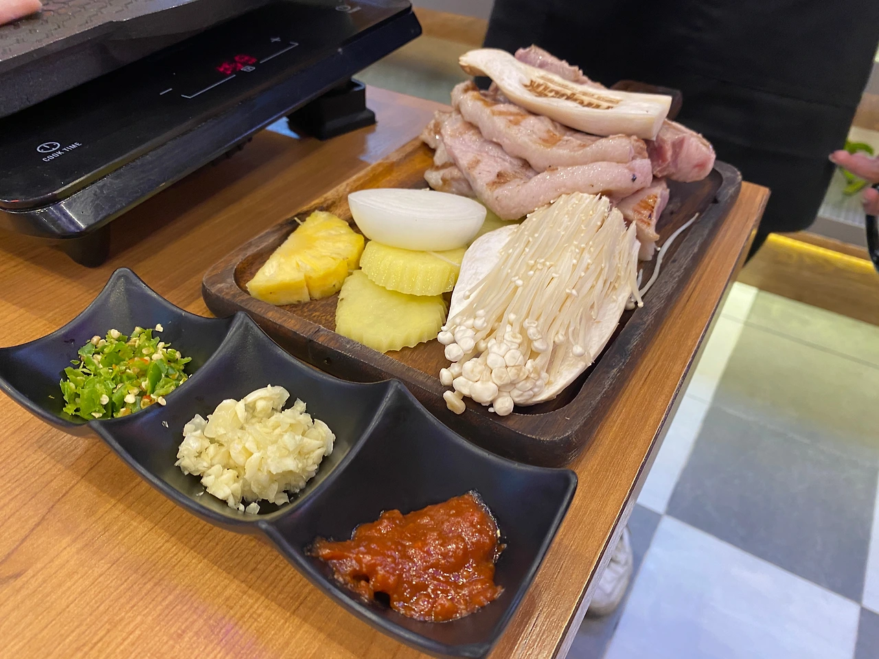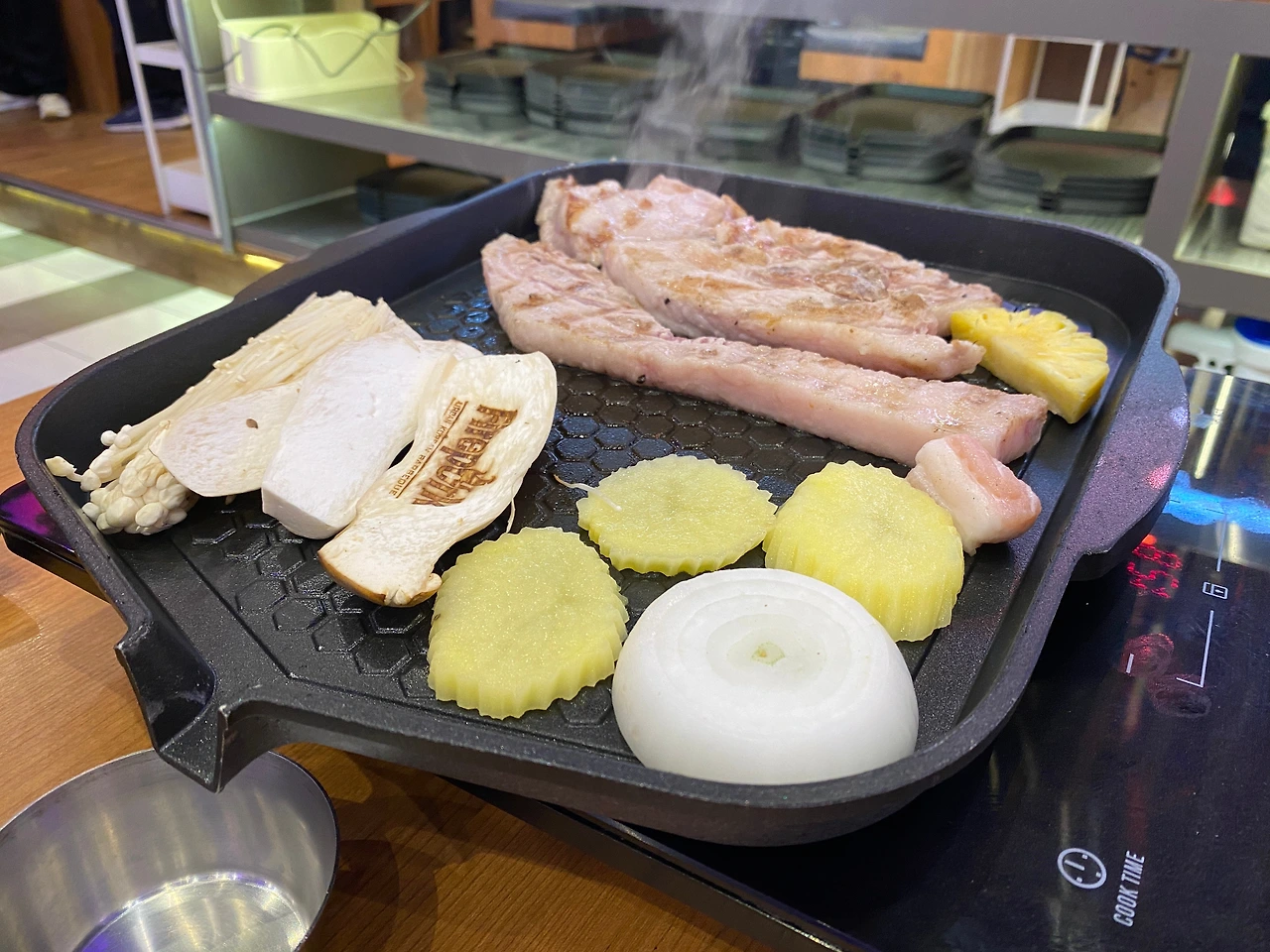 파타야에 도착해서 리조트에서 각자 쉬다가 삼겹살을 먹기 위해 터미널 21로 왔습니다. 4층에 위치한 파이어포크 초벌 생삼겹 전문점이었어요. 직접 구워주시고 샐러드바는 주문하면 마음껏 먹을 수 있는 점이 마음에 들더라고요. 슬라이스 해준 감자가 너무 맛있어서 추가해서 먹었어요.