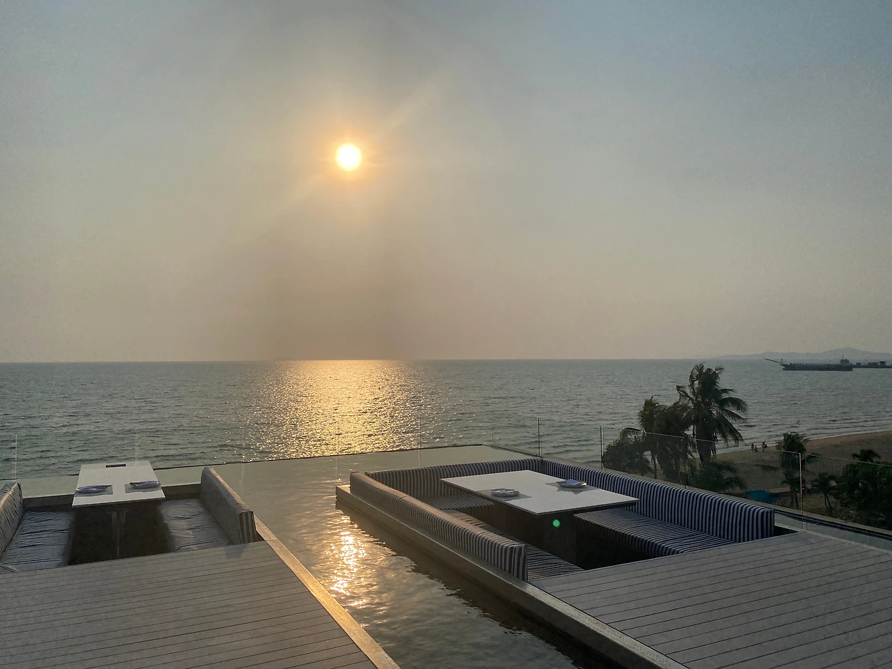 베란다 리조트 8층 저의 룸 발코니에서 바로 보이는 I Sea Sky 루프탑 바였어요. 첫 도착 날은 2~3팀 정도 보였던 거 같은데 다음날은 바 운영 시간에 제가 룸에 없어서 사람들이 얼마나 오는지 모르겠더라고요. 휴양의 목적으로만 묵었다면 저희도 한 번은 방문하여 사진 백장 찍고 칵테일도 즐기지 않았을까? 합니다. 공항으로 돌아오는 날 1시간 정도 여유가 생겨서 오픈 시간인 5시에 맞춰서 루프탑 구경도 하고 오게 되었습니다. 첫날부터 느꼈지만 여기는 풍경이 카메라에 담을 수가 없어요. 눈으로 담아야 해요! 실물이 백만 배는 아름답습니다. 카메라로 찍는 게 의미가 없더라고요. 해가 정말 가까워 서서히 해가 질 무렵에는 눈이 너무 부시기도 해요. 강가에서는 모기가 많았는데 해변이라 모기는 없었던 거 같아요. 그래서 루프탑에서 편안하게 석양을 즐기며 낭만의 시간을 보내면 좋을 거 같아요.