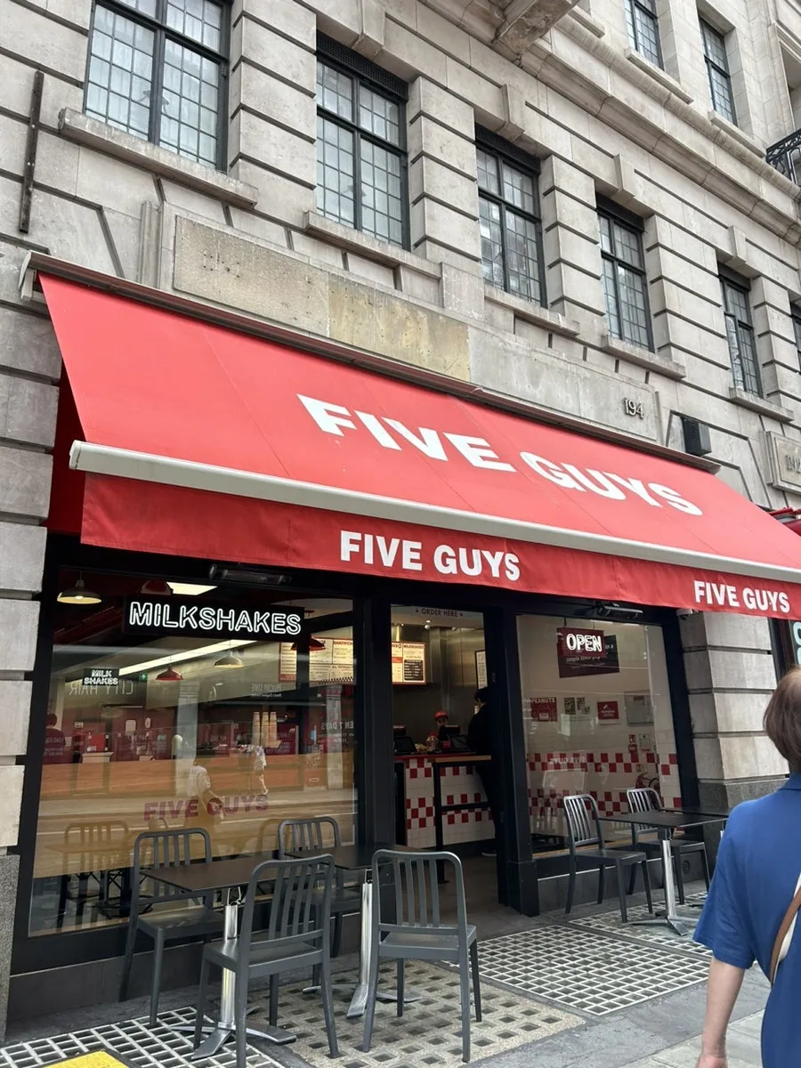 파이브 가이즈가 한국에도 생겨서 먹어봤는데, 개인적인 의견이지만 영국 파이브 가이즈가 더 맛있다고 느꼈다. 그래서 한국에서 먹었을 때 어? 내가 영국에서 먹었던 거랑 다른데? 하고 느꼈다.