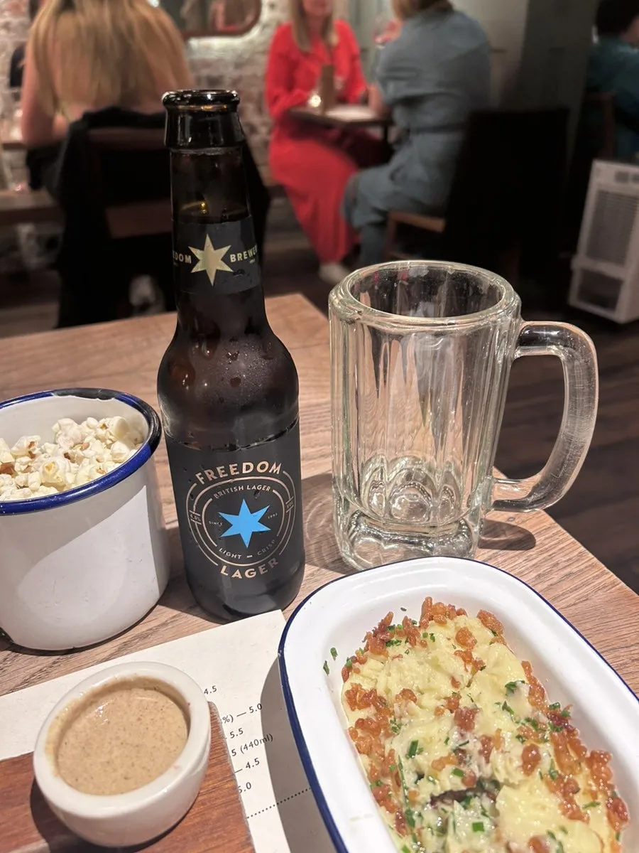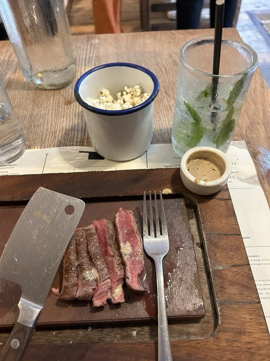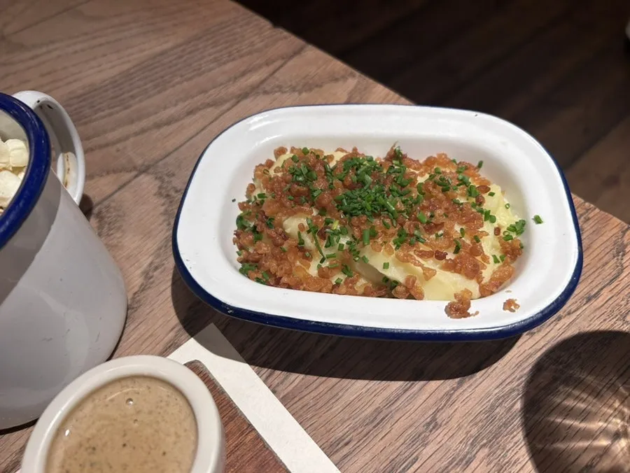 넷째, 사이드가 다 맛있다. 첫 번째 소호거리에서는 시금치 수프에 직원이 추천해 주신 머시룸 소스와 에이드로 선택했었다. 시금치 수프 호불호 갈리게 생길 비주얼이지만 일단 나는 호였다. 시금치 수프 자체만 먹으면 그냥 그런데 고기랑 같이 먹으니까 맛있었다. 세 번째에 갔던 코벤트 가든에서는 Crispy Bone Marrow Garlic Mash로 시켰다. 시금치보다는 맛있는데... 아니 사실 엄청 맛있었다. 감자라 별로 짜지도 않고 위에 올려진 토핑이 아삭거려서 씹는 맛이 있다. 감자 맛 사이드 꼭 시켜 먹어 보세요.