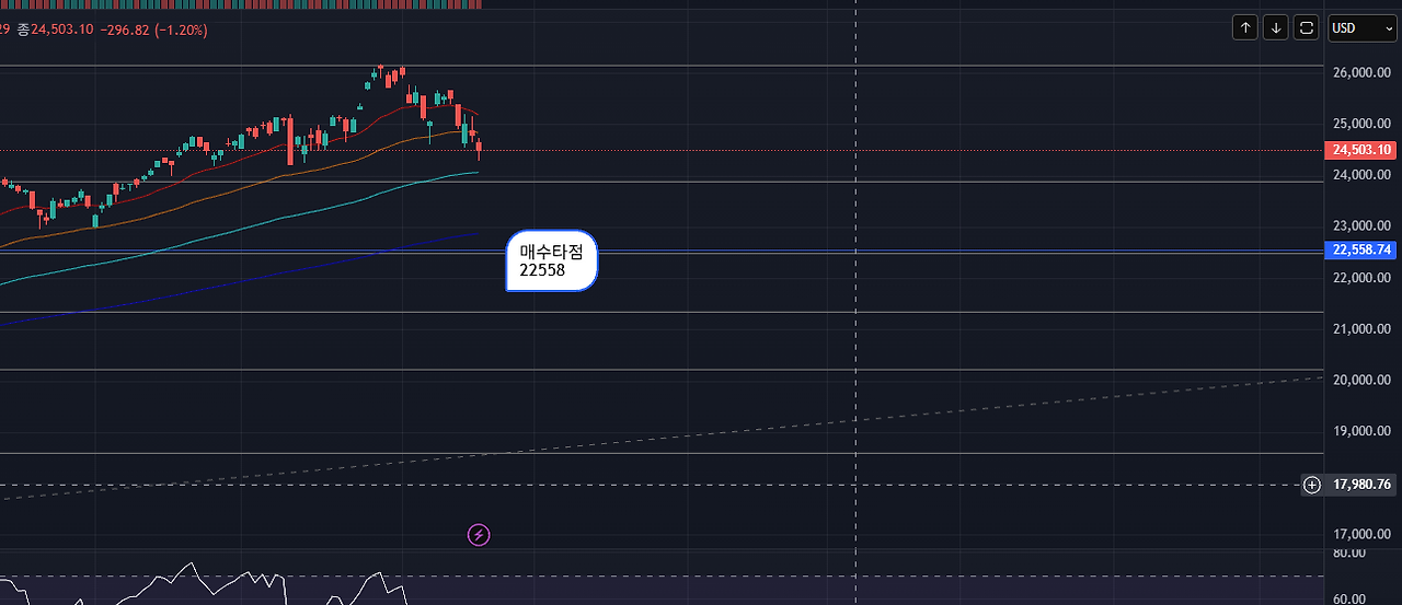 NDX 반등예상지점 22500~22558 일봉 기준 앞전 캔들보다 큰 거래량 실린 양봉확인후 매수