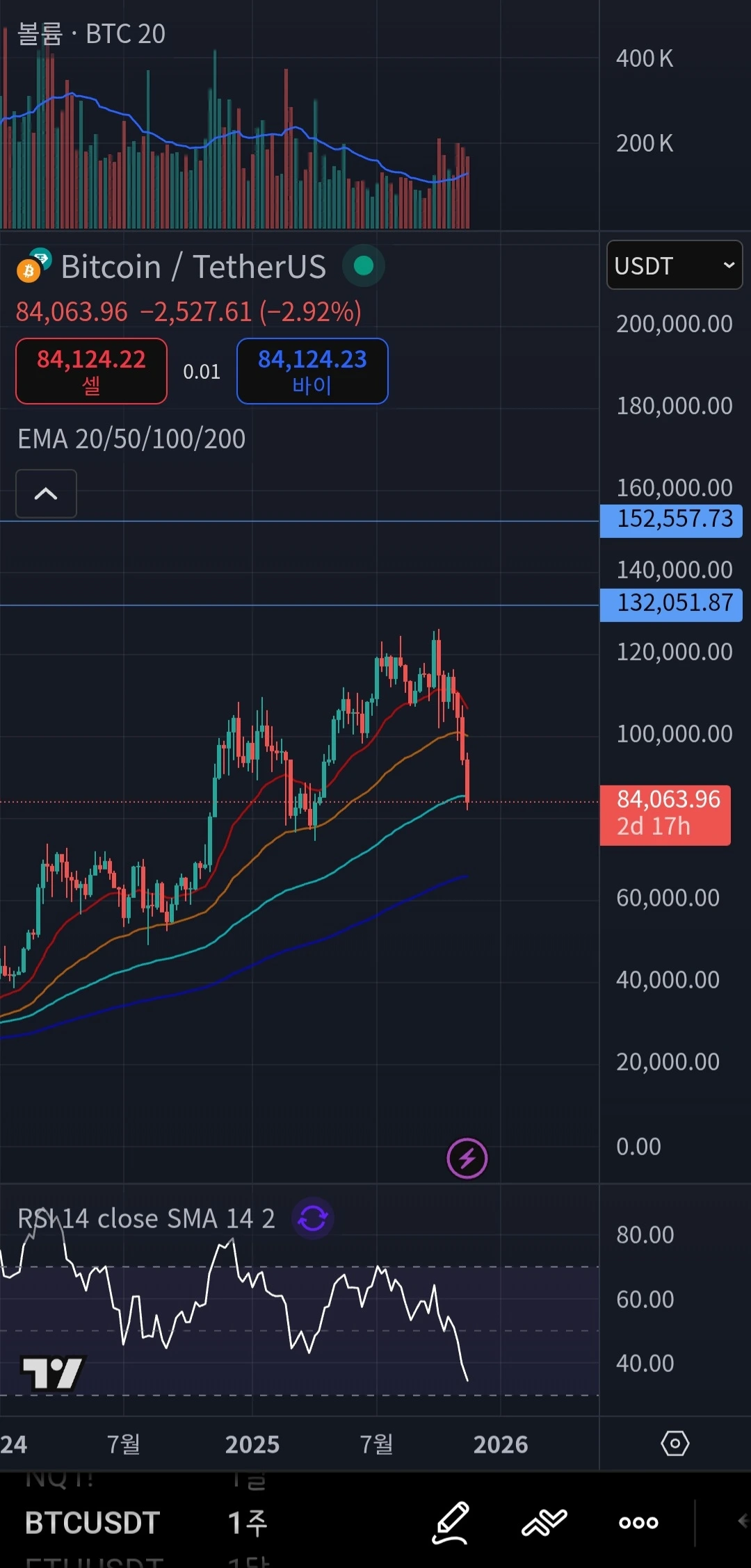 현재 가격($84k)과 200일선 사이의 이격이 좁혀지고 있어, 추가 하락 시 이곳에서 강력한 기술적 반등(V자 반등)이 나올 확률이 매우 높습니다.