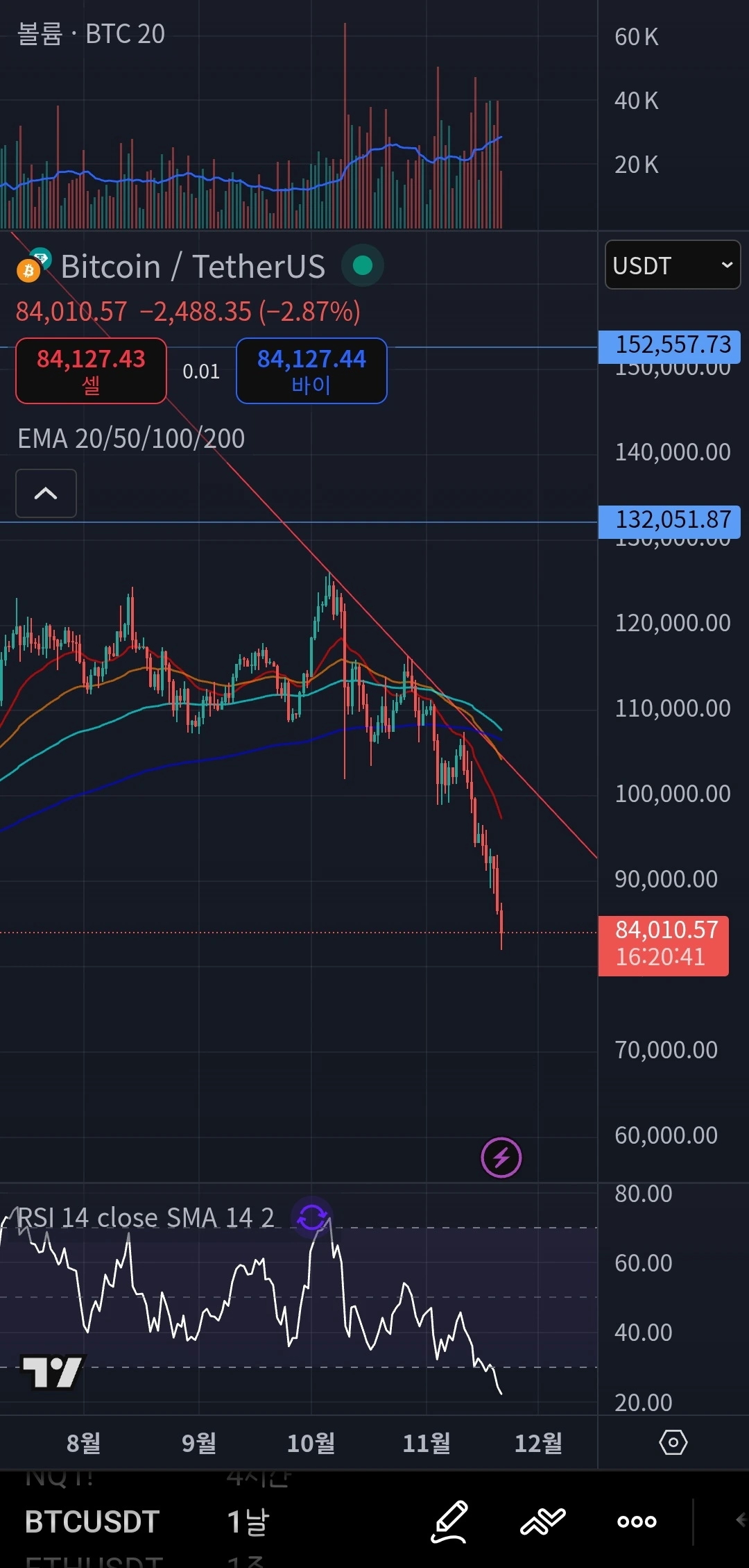 일봉상 캔들이 모든 단기 이평선을 이탈했지만, 최하단의 EMA 200선(약 $78,000 ~ $80,000 추정)이 다가오고 있습니다.