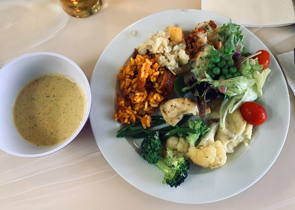 식사는 뷔페식에 누구나 즐길만한 무난한 서양식의 메뉴들로 이뤄져 있으며 식후 디저트로 과일과 케이크 등이 준비되어 있는데 한 끼 식사로 손색이 없다. 이번에도 운 좋게 창가 자리에 앉은 덕분에 창문 너머로 신데렐라 성의 아름다운 자태를 감상하며 식사할 수 있었다. 신데렐라 성을 바라보며 먹는 음식은 정말로 꿀맛이었다. 그렇게 음식들을 꿀꺽하고 났더니 드디어 기다리던 곰돌이 푸우와 친구들이 등장했다!