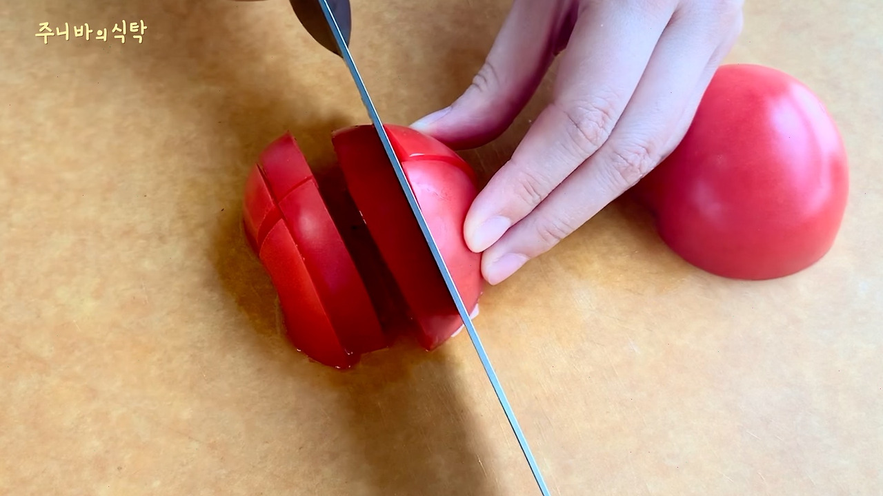 가지 옆 매대에는 새빨간 완숙 토마토가 쌓여 있었다. 토마토 앞으로 집결한 사람들은 홀린 듯 너도나도 봉지에 토마토를 담기 바빴다. 사람들의 틈바구니에서 가장 탐스러워 보이는 가지와 토마토를 장바구니에 가득 담았다.