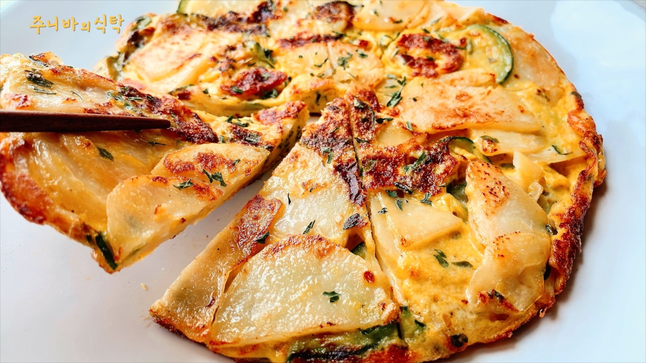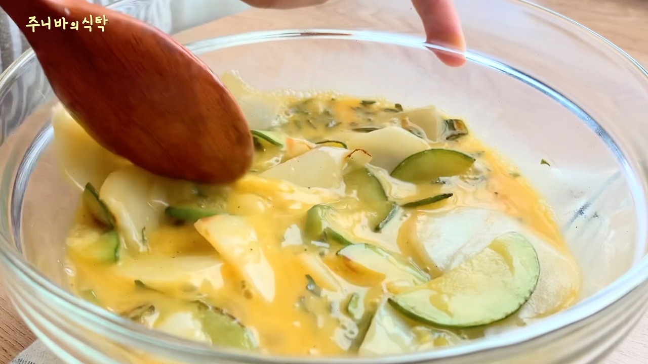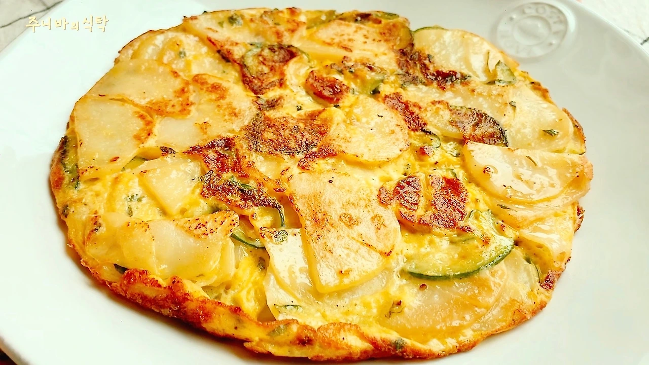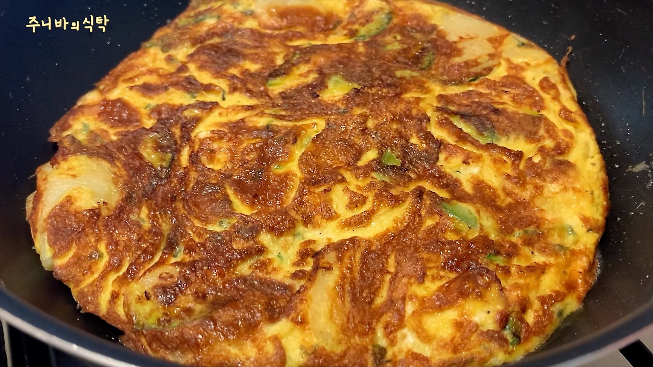 칼로리를 낮추기 위해 부침가루 대신 계란을 넣었는데 감자가 지닌 전분 덕분인지 계란만으로 찢어짐 없이 예쁜 전 모양이 나왔다. 지글지글 노랗게 익어가는 감자 사이로 슬쩍 비치는 푸른 애호박에 침이 꼴딱 넘어갔다. 애호박 본연의 아삭하고 달달한 식감을 즐기기엔 전으로 부쳐먹는것 만한게 없다.