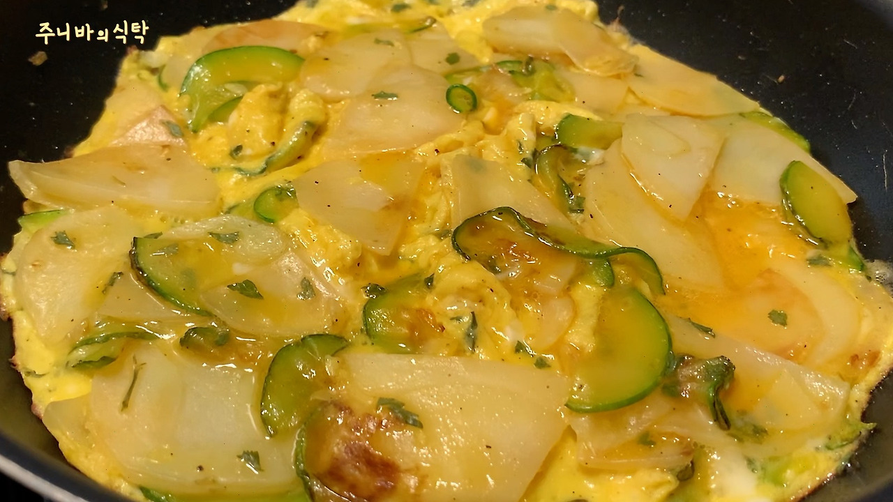 감자 1개 (200g), 애호박 1/3, 계란 3개, 소금 1.5 티스푼, 후추, 파슬리, 올리브유