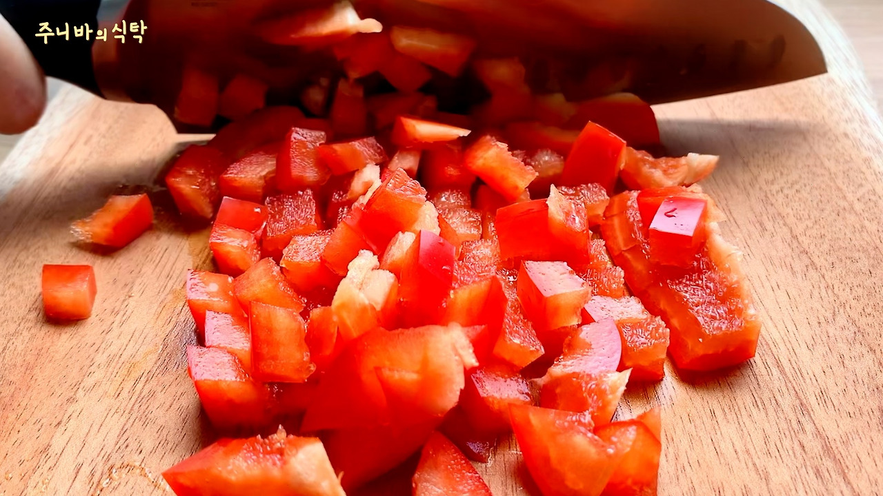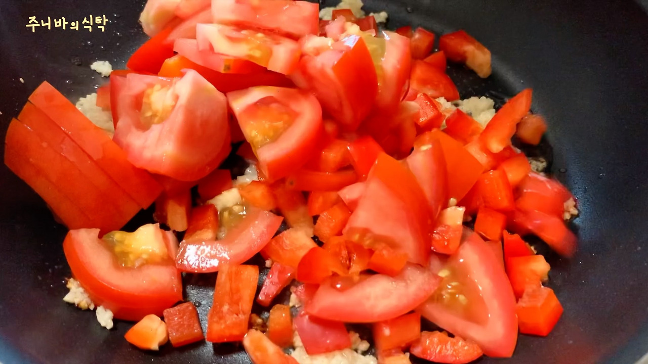 1. 토마토와 파프리카를 잘게 썬다. (파프리카는 생략가능하지만 넣으면 훨씬 맛있다. 양파를 넣어도 맛있다.)