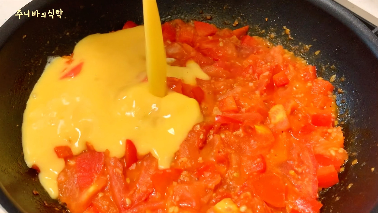 3. 토마토가 완전히 익어 물렁해지면 계란물을 넣는다.