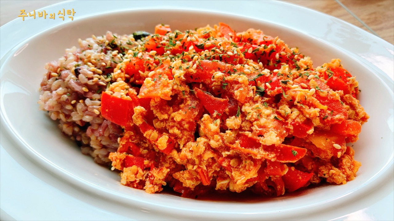 토마토 2개, 계란 2개, 파프리카 1/2(선택), 다진 마늘 1큰술, 알룰로스 1/2큰술, 간장 1큰술, 소금 1/2 티스푼, 참기름 1큰술, 올리브유, 파슬리, 깨, 밥(선택)