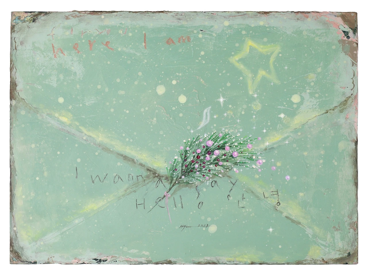 작은 새 한 마리, 케이크, 편지는 작가님의 시그니처다. 모두 다 좋지만 이번 글에서는 편지를 소개하고 싶다. <Here I am> 그림에는 땅에서 피어난 꽃 한 다발과 별이 빛나는 우주가 담겨 있다. 땅에 발을 딛고 우주를 바라보는 하얀 작은 새는 나이자 우리 모두이기도 하다. 편지 안에는 마음속 나의 이야기, 우리네 삶이 또박또박 우리의 발자국처럼 남겨져 있다. 어떤 이야기를 남길지는 우리 몫이다. 이 그림을 보고 있노라니 작가님이 첫 만남에서 해주신 이야기들이 적힌 편지를 꺼내 보는 느낌이다. 이번엔 작가님께 답장을 써 보려고 한다. 다정한 인사와 함께, 감사한 마음을 담아.
