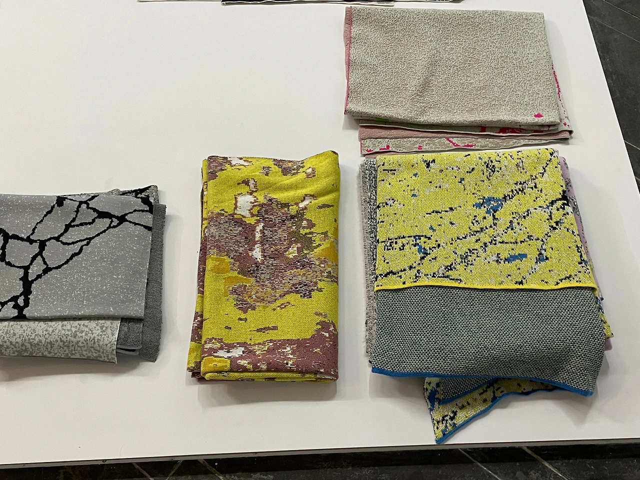 아래층으로 내려가자 가장 먼저 눈에 띈 것은 넓은 홀 아래 펼쳐진 다양한 모표들이었다. <Passage>라고 이름 붙여진 이 작업 위에 작가가 맨발로 올라가 다른 사람들과 이야기를 나누고 있었다. 아무래도 막 퍼포먼스가 끝나고 정리하던 참이었던 것 같다. 지하에 있는 오브제들도 공예적 성질이 강한 재료들로 구성되어 있었다. 유리와 모포들…. 특히 모포들은 넓은 홀 안에 다양한 색깔과 모티브를 통해서 각기 다른 크기와 방식으로 접혀서 일종의 구성을 만들어내고 있었다.
