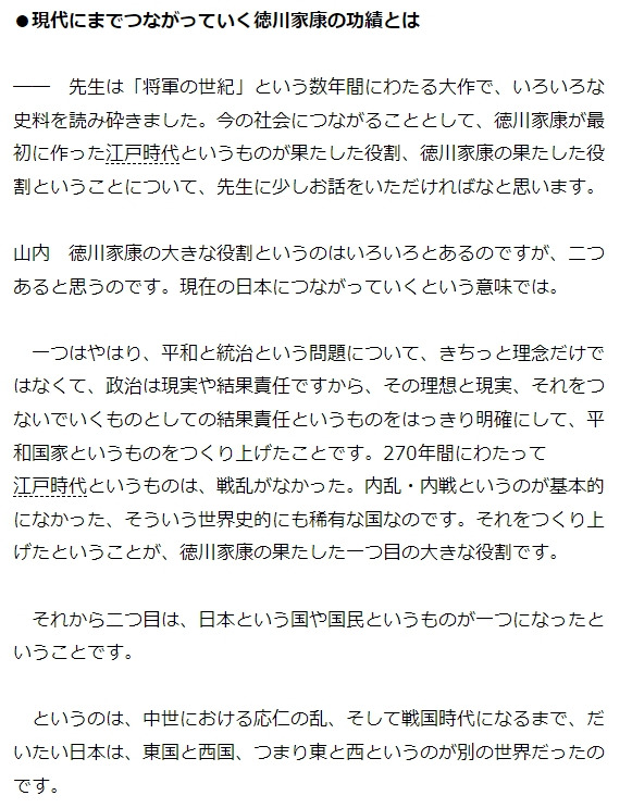 도쿠가와는 집권하자마자 광해군과 평화조약을 맺고 에도시대를 정착시킨 인물이다. 위에서와 같이 일본은 도쿠가와 이후 무려 270여 년간 평화와 경제적 번영을 구가했고 이를 바탕으로 메이지 유신을 통해 스스로 근대화에 성공하게 된다. 내전과 외전에 시달리던 일본에 평화와 번영 체제를 구축한 것이 그의 최대 치적으로 꼽히는 것도 무리는 아니다. 도쿠가와는 세키가하라 전쟁 승리 후 적군 중 단 3명 만을 제거하고, 자신의 포위망을 뚫은 조슈번(현 야마구치현)과 사쓰마번(현 규슈 남부)을 살려준 것은 유명한 이야기다. 이후 이 두 지역 출신 인물들이 메이지 유신의 주역이 되니, 인재를 죽이지 않고 살려둔 도쿠가와의 안목이 빛나는 장면이다.