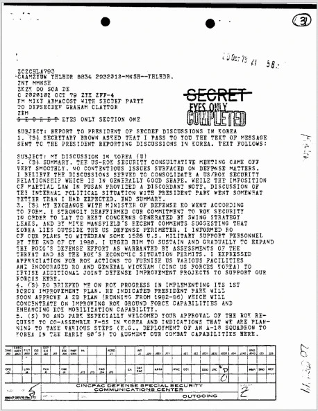 <출처 : Cable, Mike Armacost to Deputy Secretary of Defense Claytor, Subject: Report to President of Secret Discussions in Korea, October 20, 1979 Secret>