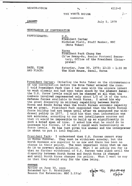 <출처 : Memorandum of Conversation, President Jimmy Carter, South Korean President Park Chung Hee, et al, June 30, 1979, Secret>