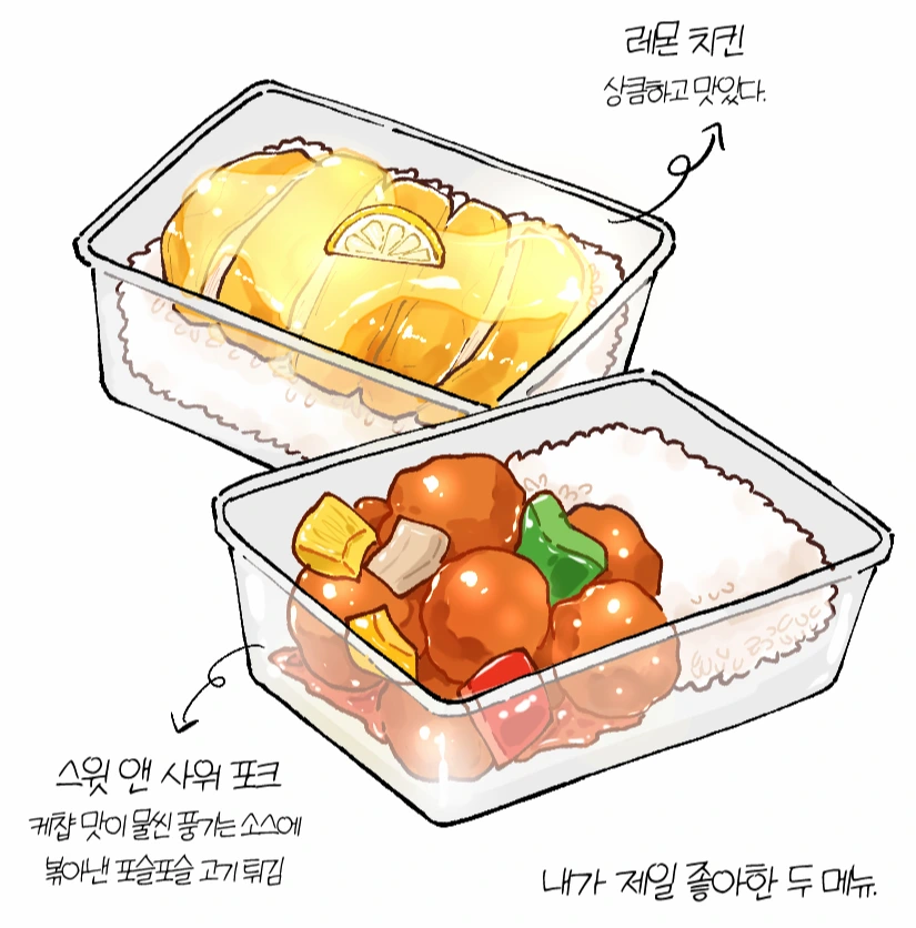 레몬 치킨은 넓적한 닭고기를 통으로 튀겨 큼지막하게 썰어낸 다음 그 위에 새콤달콤하고 걸쭉한 레몬소스를 끼얹는 요리로, 내가 정말 좋아해서 점심시간에 자주 먹었다.