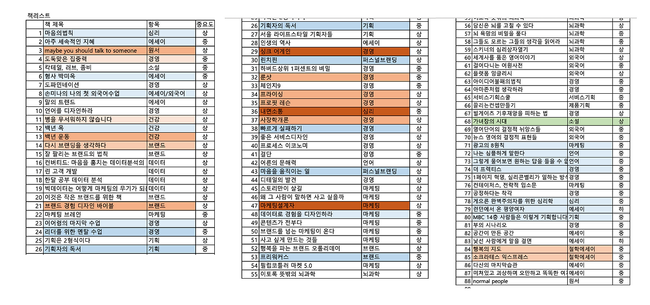 읽고 있었던 책들 연하늘색, 두께가 읽는 책들은 주황색. 중간에 새로 구입하게 될 책? 또는 집으로 입고될 책 (도서관 활용 등)은 초록색으로 구분해 볼 예정이다.