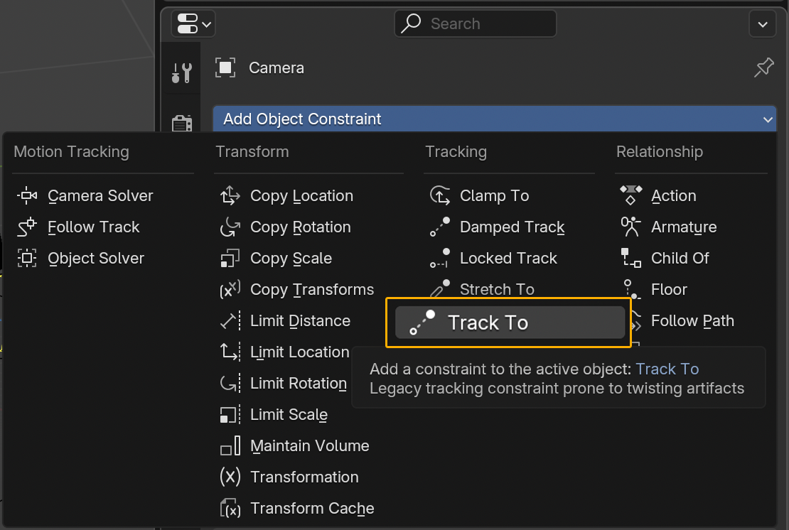 이때 사용하는 기능이 바로 Track To 제약 조건(Constraint)입니다. Track To는 카메라의 시선을 특정 대상(Object)에 고정해 줍니다.