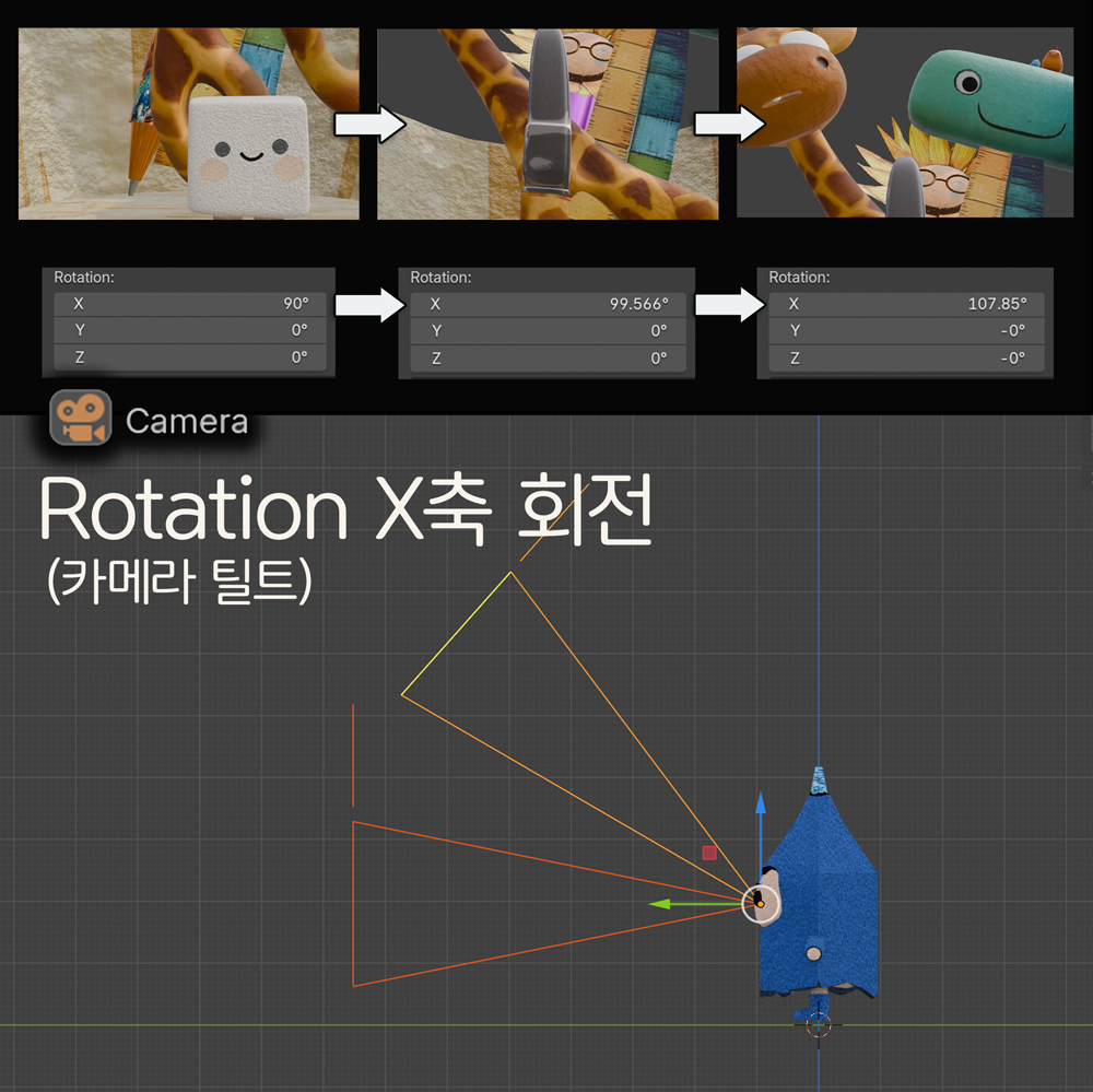 Tilt는 카메라를 제자리에 고정한 채, 위아래로 바라보는 회전(수직 회전)