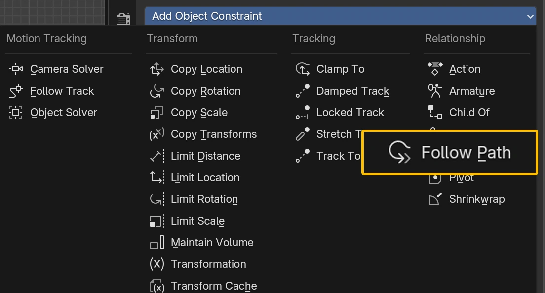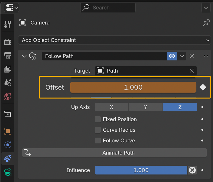 카메라 속성창에서 Constraints(제약 조건) 패널을 열고, Add Object Constraint에서 Follow Path를 선택합니다.