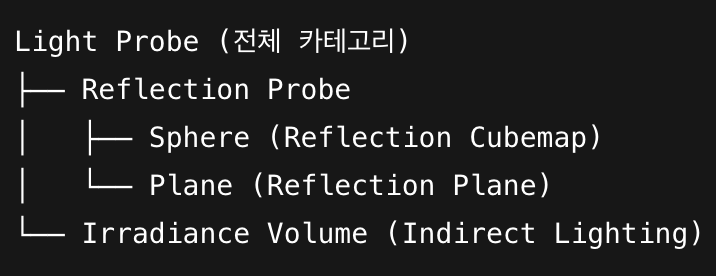 Reflection Probe는 Light Probe의 한 종류입니다. Light Probe는 Eevee에서 빛을 계산하는 장치 전체를 말하고, Reflection Probe는 그중에서도 반사 전용Light Probe를 가리킵니다.