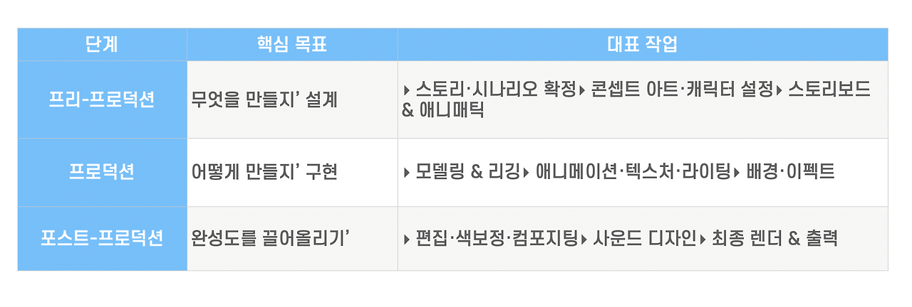 애니메이션 제작을 효율적으로 완성하기 위해 크게 나눈 세 단계입니다.