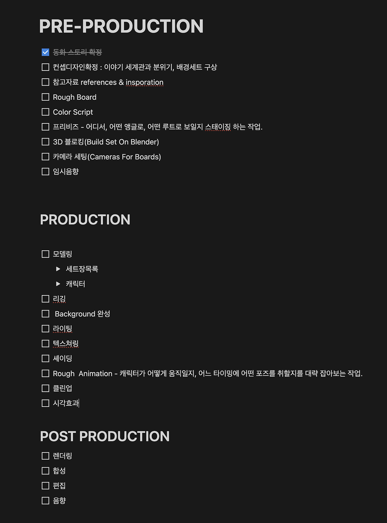 프리-프로덕션 : 시나리오 확정, 스토리보드 제작, 콘셉트 아트 작업 등
