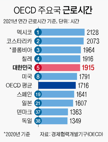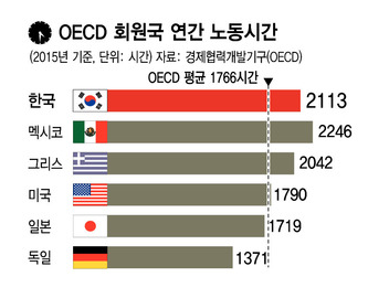 한국 근로시간 10년간 10.3% 감소, 아직은 OECD서 5번째 많아