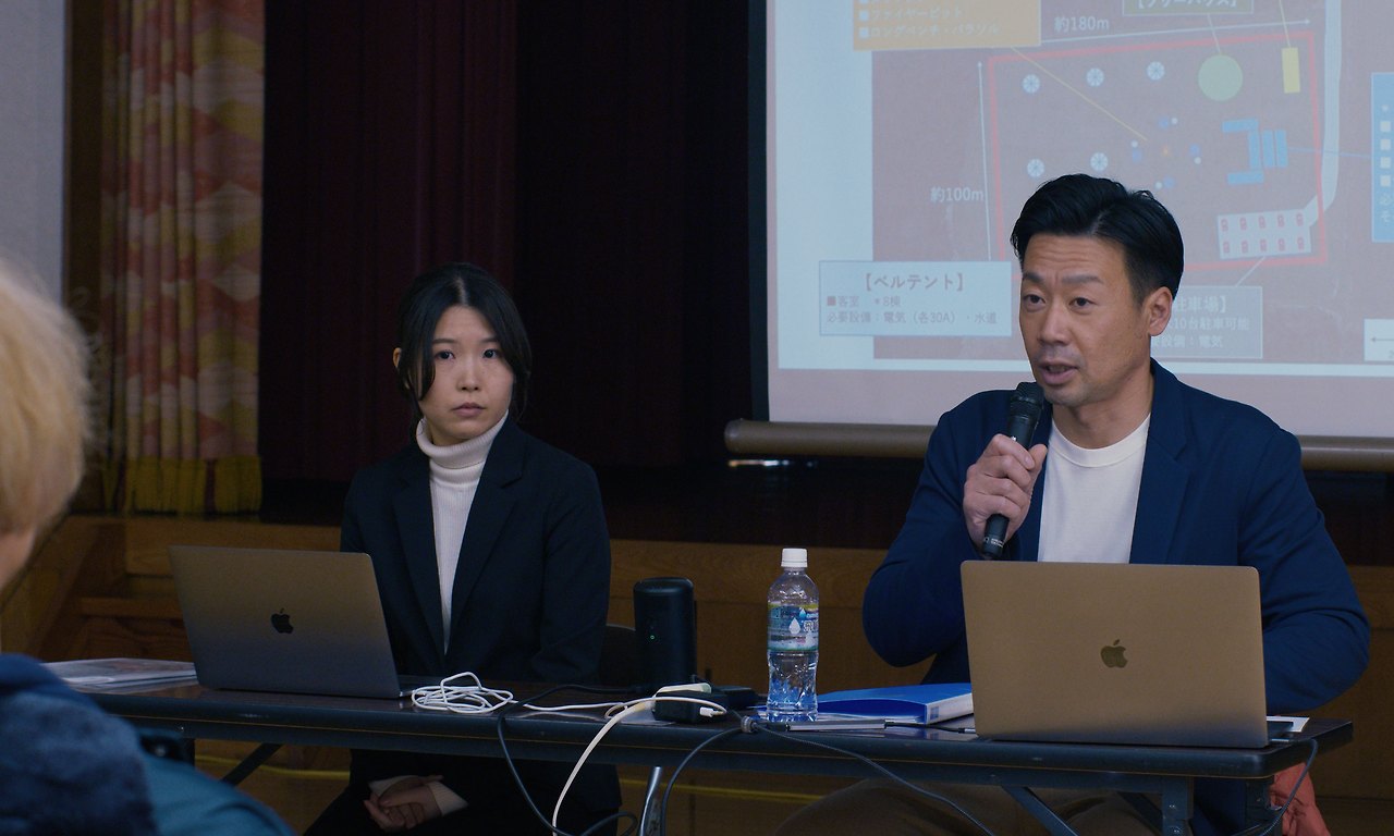그러던 어느 날, 이 마을을 개발하겠다는 사람들이 찾아온다. 연예 기획사 플레이모드의 직원이자 글램핑장 건설 추진에 담당자인 타카하시와 마유즈미가 말이다. 그들은 설명회를 열어 강 상류에 있는 이 마을에 글램핑장을 만들면 수익사업의 기회도 늘어나고 마을을 더 발전시킬 수 있다고 이야기한다. 하지만 주민들은 글램핑 이용자가 만들어내는 오폐수 문제, 소음 문제 등을 어떻게 책임질 거냐고 따져 묻는다. 이들은 이에 대해 우물쭈물 말을 삼킬 뿐이다. 분노한 주민들은 하나 둘 언성을 높이고 첫 설명회는 그렇게 막을 내린다. 설명회가 끝나고 이들에게 마을회장이 타쿠미의 연락처를 받아서 그와 소통을 하라는 조언을 한다.