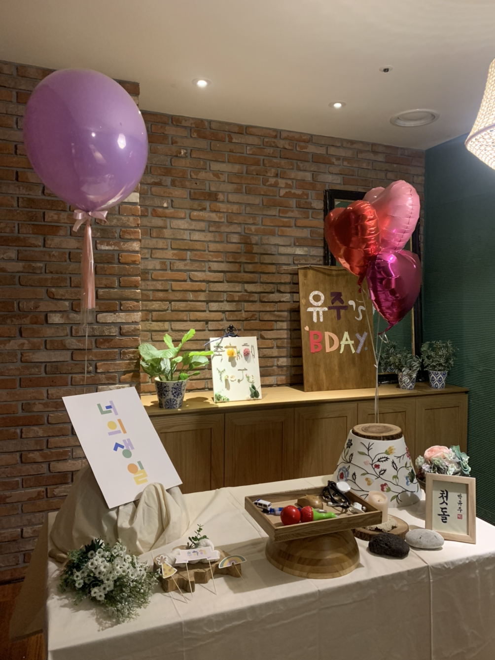 우리는 가족들과 함께 작은 돌잔치를 하기로 마음을 정했다. 돌잔치를 할 곳에 전날 방문하여 미리 돌상을 차려 둘 수 있었다. 대여하지 않고 하나하나 고민하며 준비한 소품들로 손님을 맞이할 룸을 우리의 빛깔로 정갈하게 다듬어갔다.
