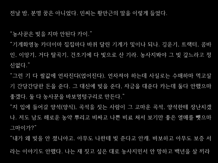 “황만근은 이렇게 말했다, 그럼 너는? 이라고 나에게 묻는 것 같았다. '빚 안 지고 짓고 싶은 농사 실컷 지으면서 안 망하고 백 년을 살 거라'고 했던 황만근의 말을 곱씹으며 나는 어떤 말을 할 수 있을지 생각하게 됐다.”