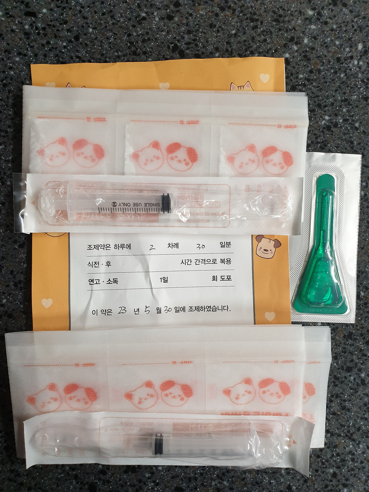 그러다 우연히 주사기를 사용하면 편하게 먹일 수 있다는 걸 알게 되었다. 문제는 주사기가 처음 사용하면 부드럽게 잘 작동하지만 아무리 씻어도 내부에 약이 쌓이다 보니 며칠 지나면 뻑뻑해진다. 그래서 한 달에 한 번 약 받을 때 반드시 주사기를 달라고 한다.