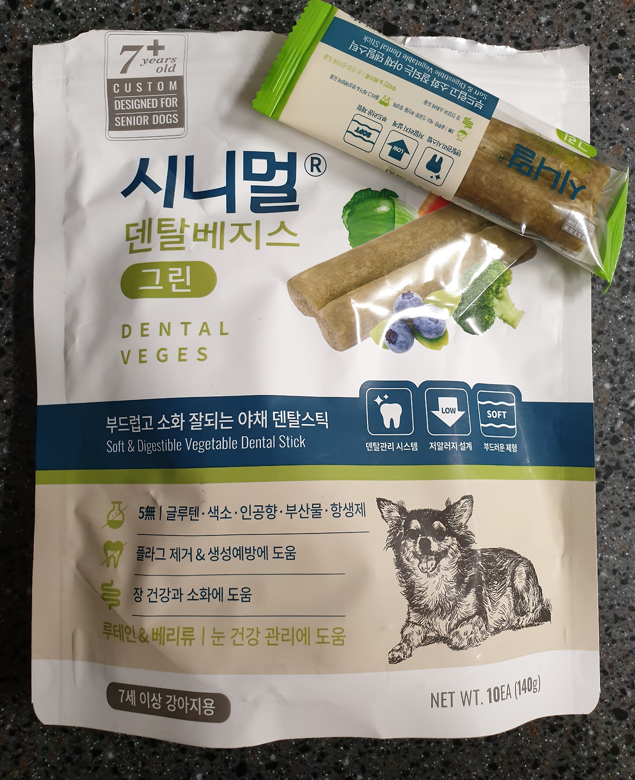 최근엔 한 가지 고민이 더 생겼다. 노견에게 이렇게 계속 다이어트 사료만 먹여도 되냐는 질문이 머릿속을 떠돌았다. 그래서 며칠 전 노견용 시니어 사료를 주문했다. 아예 시니어 사료로 갈아타기엔 목표 몸무게를 달성하지 못해서 다이어트 사료와 반반씩 섞어서 먹이고 있다. 시니어 사료는 몇 달 전 ‘펫 페어’ 행사에 참여했을 때 샘플로 받은 건데 코코가 엄청 잘 먹었다. 시니어 사료라 딱딱하지 않아 부담 없이 잘 먹었다. 그리고 간식은 고기를 최대한 피한다. 사더라도 작은 것만 고른다. 최근에 잘 먹는 간식은 채소 성분으로 된 덴탈껌인데 겉보기엔 딱딱해 보이지만 안에 구멍이 뚫려있어 부드럽게 먹을 수 있다.