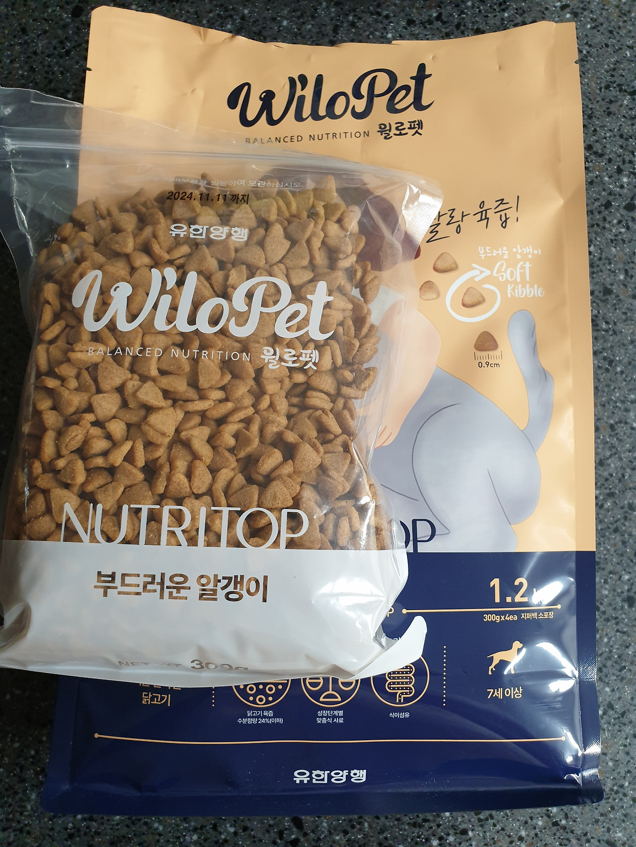 최근 먹이기 시작한 시니어 사료. 기호성이 좋다.