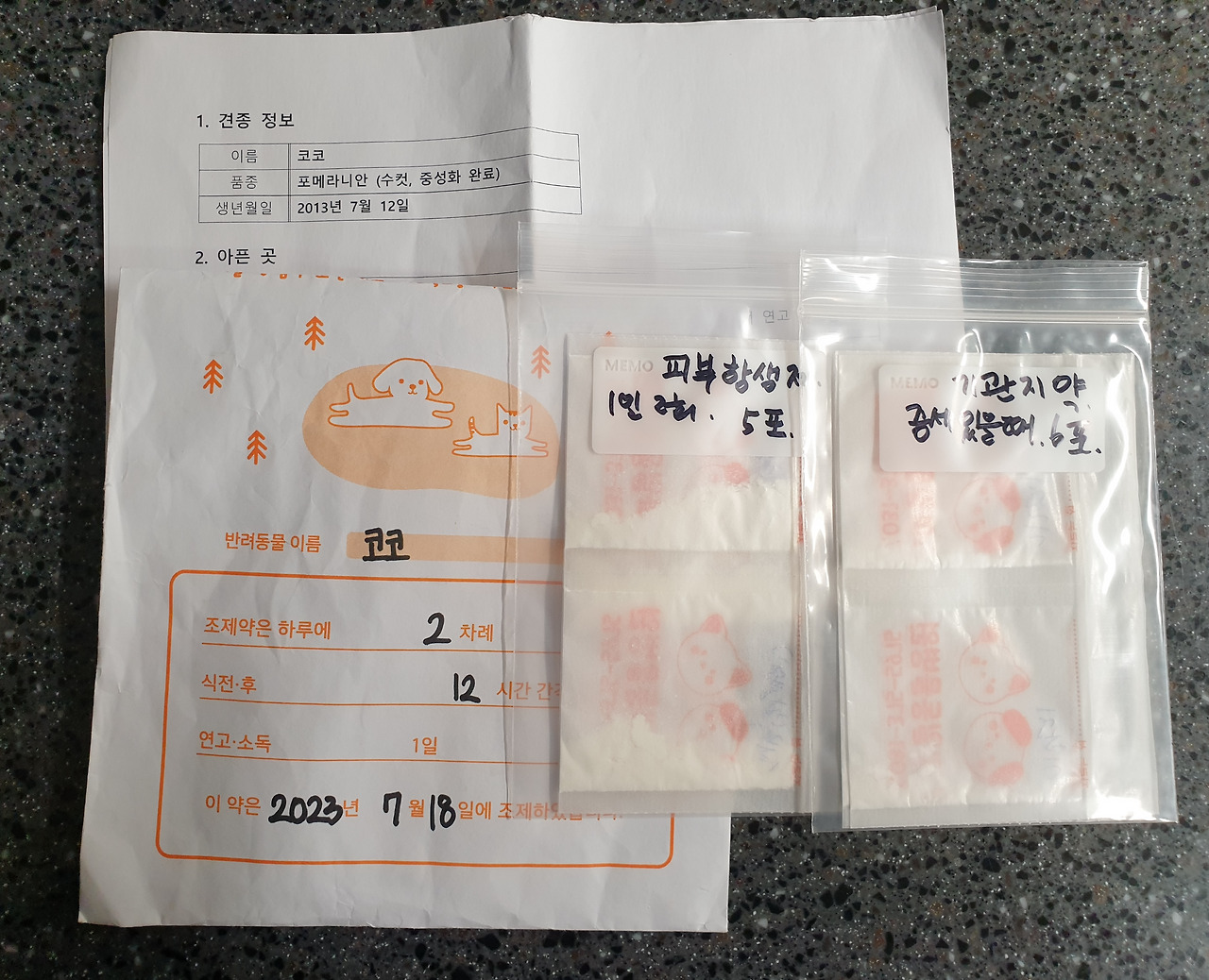 코코가 먹던 약들이다. 저거 말고도 몇 개가 더 있다. 그리고 아픈 곳과 먹던 약, 영양제를 정리해서 가져갔다.