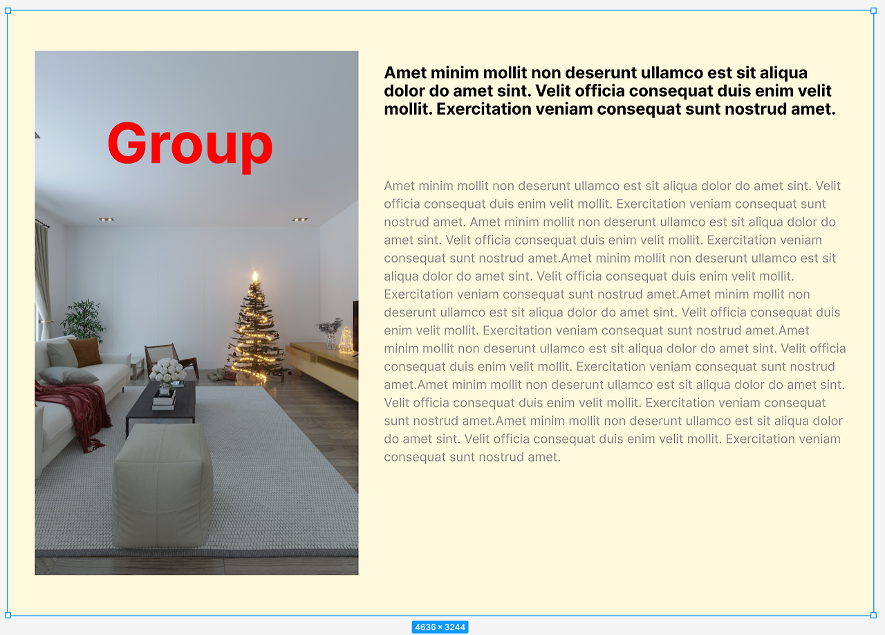 이번에는 동일한 이미지, 텍스트 요소를 사각형(R)을 만들어 그 위에 위치 시켜놓은 상태에서 그룹 Command + G 으로 만들었습니다.