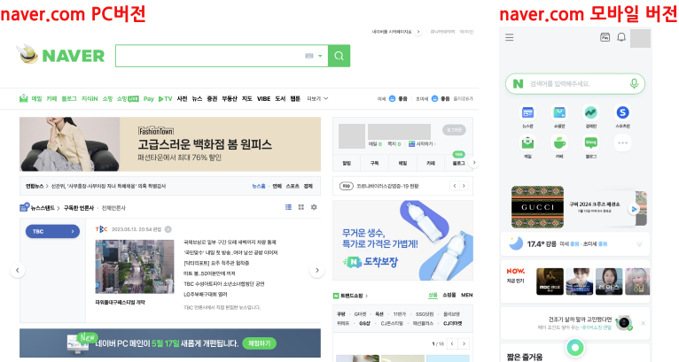 이를테면 네이버를 생각하시면 쉬워요. 우리가 PC에서 네이버에 접속하면 www.naver.com 이라는 경로로 접속이 되지만, 핸드폰에서 접속을 하게되면 m.naver.com 이라는 경로로 자동적으로 연결이 됩니다. 다만 이 경우 사용자가 직접 해당 URL을 입력해서 접속하는 것이 아니라 www.naver.com 이라는 URL을 입력하게 되면 해당 사용자가 접속한 디바이스를 판단하여 모바일이라면 m.naver.com 이라는 경로로 포워딩을 시켜 웹사이트를 보여주는 방식입니다.