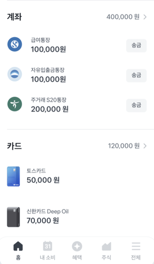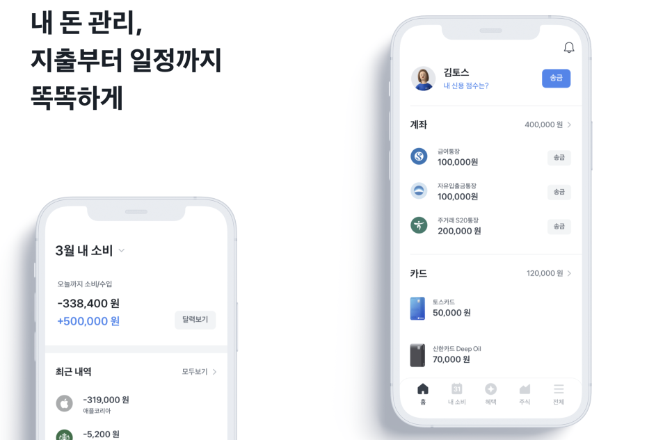 우리가 실습할 화면은 위의 이미지 중에서 오른쪽에 위치한 이미지, 토스 회원에게 제공되는 메인 화면입니다.
