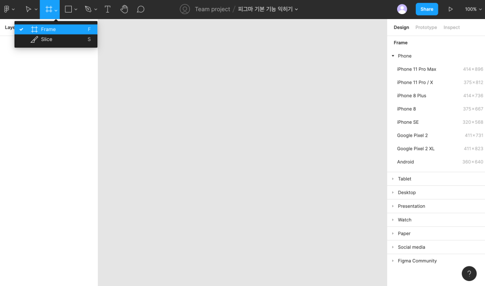 아주 친절하게도 피그마는 필요한 프레임의 크기를 고민할 필요도 없이 디바이스/미디어별, 해상도별 프레임을 클릭 한번으로 선택할 수 있습니다.